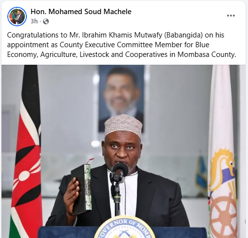 “Congratulations to Mr. Ibrahim Khamis Mutwafy (Babangida) on his appointment as County Executive Committee Member for Blue Economy, Agriculture, Livestock and Cooperatives in Mombasa County,” Hon. Machele stated.