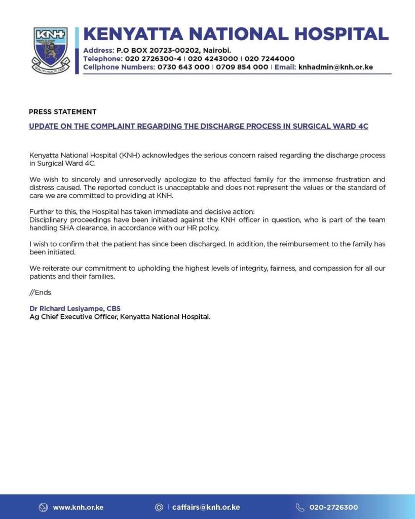 In response to the growing public outcry, KNH released an official press statement signed by its Ag. Chief Executive Officer, Dr. Richard Lesiyampe.