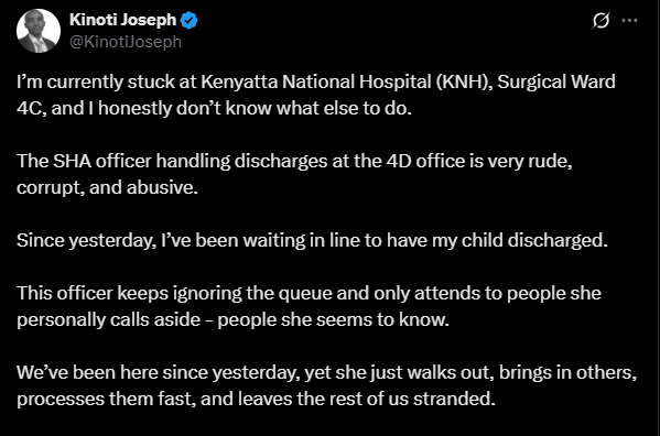 The incident came to light after Kinoti Joseph took to social media platform X (formerly Twitter) with a desperate plea for help. In his post, he detailed a harrowing ordeal at the hospital’s Surgical Ward 4C, where he had been waiting since the previous day to have his child discharged.
