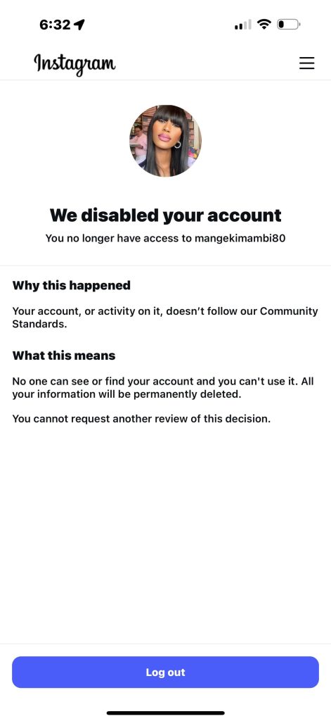 Kimambi shared screenshots showing Meta had disabled her personal Instagram account (@mangekimambi80), her news page (@wananchiforum), and her WhatsApp number (+1-424-537-3057). She directly linked the restrictions to her posts documenting the post-election unrest and evidence received from citizens on the ground.