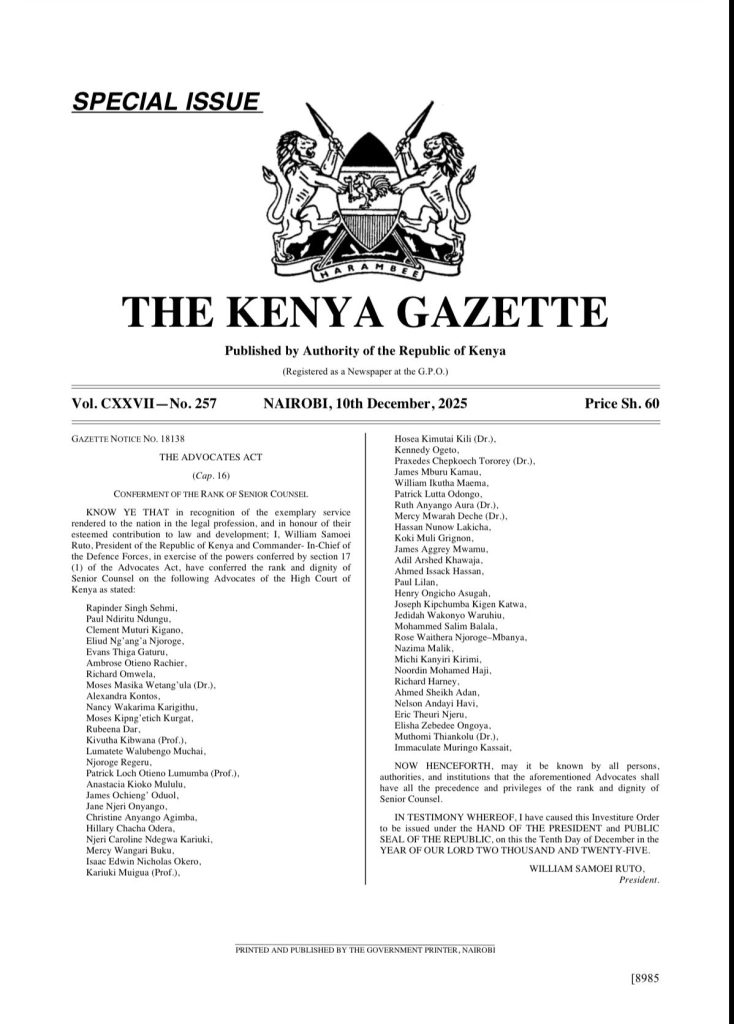 The appointments, published in a special edition of the Kenya Gazette on Tuesday, December 10, 2025, represent one of the most significant elevations to the Senior Counsel rank in recent years, underscoring the administration’s commitment to recognizing excellence in legal practice and scholarship.