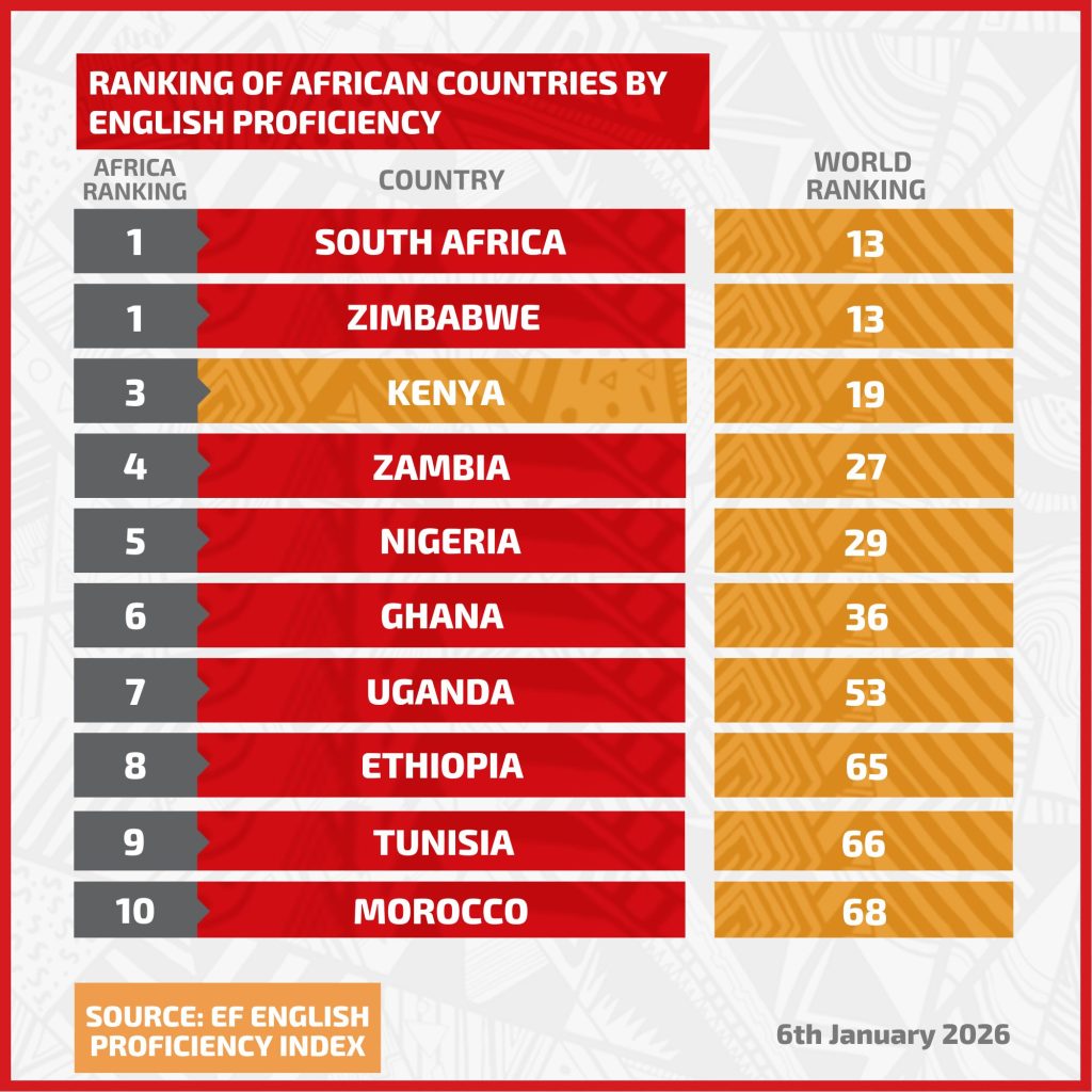The 2025 English Proficiency Index (EPI), published by EF, positions Kenya behind only South Africa and Zimbabwe on the continental rankings, surpassing prominent nations including Nigeria, Uganda, Ethiopia, and Morocco.