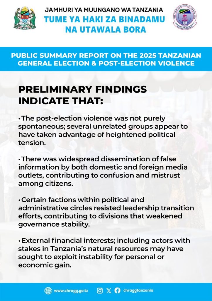 DAR ES SALAAM — Tanzania’s post-election violence stemmed from a complex convergence of misinformation, opportunistic actors, and external financial interests rather than spontaneous political unrest, according to preliminary findings released by the country’s human rights watchdog.
